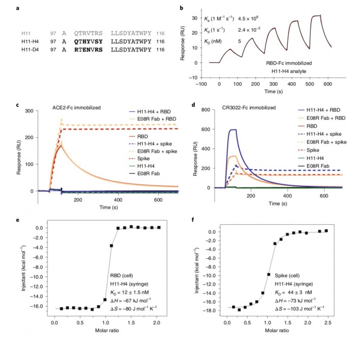 利用天然的大羊驼单域抗体库和基于PCR技术,研究团队制备了两个密切相关的纳米抗体,即H11-D4和H11-H4,它们能结合RBD(KD分别为39 nM和12nM),并阻断其与ACE2的相互作用。