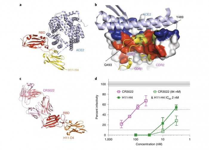纳米抗体-Fc融合显示对SARS-CoV-2具有中和活性(对H11-H4为4-6nM,对H11-D4为18nM),与人源抗体CR302216联用还能增强中和能力。