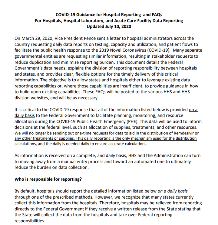 据《纽约时报》周二发表的报道称,特朗普政府现在命令医院向华盛顿特区的一个数据库发送新冠患者数据,这是一项可能绕过美国疾病控制和预防中心(CDC)的新举措的一部分。据《纽约时报》报道,在美国卫生与公众服务部(HHS)网站上发布的一份文件中概述,医院被命令直接向政府发送数据,从周三起生效,这一举动已经惊动了CDC内部的一些人。