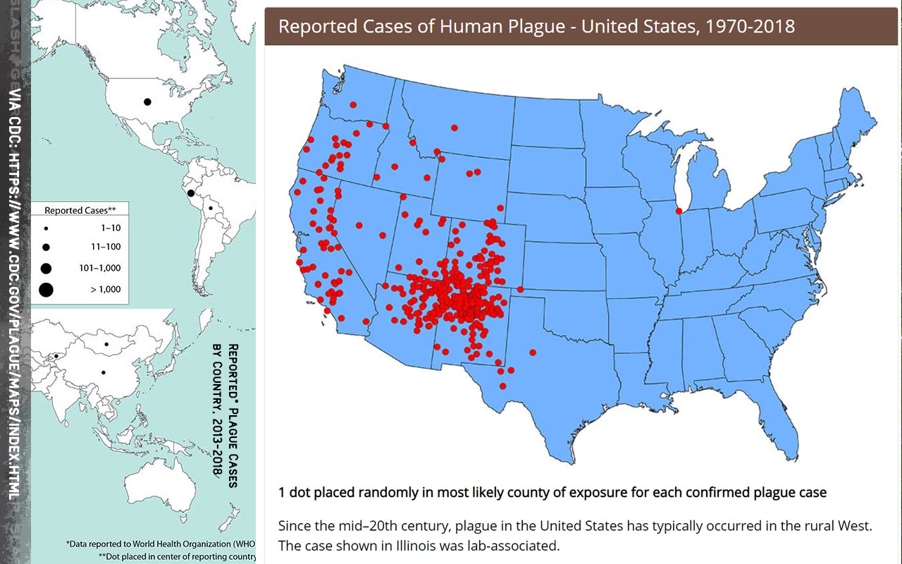 鼠疫在美国并非闻所未闻--2018年6月,爱达荷州出现了一例儿童黑死病。PBS 2017年的一份报告显示,1900年至2015年,美国总共发生了1036例人类鼠疫病例,平均每年9例。