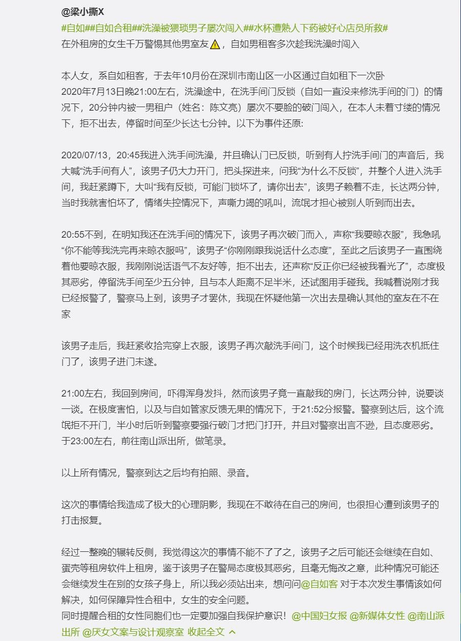 7月14日消息,广东深圳梁女士发文称自己在洗澡时被一名自如合租男子破门而入。梁女士描述,在听到有人拧洗手间门后大喊“洗手间”有人(自如一直未修洗手间的门),而这名男性依然把头探进了洗手间并问“为什么不反锁”。随后该男子再次破门而入声称要晾衣服,还声称“反正你已经被我看光了”,态度极其恶劣。