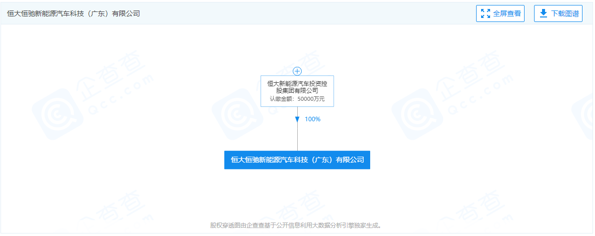 据企查查数据显示,7月10日,恒大恒驰新能源汽车科技(广东)有限公司正式成立,注册资本为5亿元,法定代表人法定代表人为周彬,所属行业为汽车制造业。该公司由恒大新能源汽车投资控股集团有限公司 100% 控股,经营范围包括:新能源汽车相关技术研究、技术开发服务、软件产品开发和生产、信息技术咨询服务、汽车零部件及配件制造以及销售等。