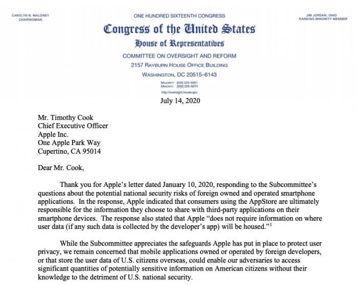 国会委员周二致信苹果和谷歌,敦促两家科技巨头密切监管与境外实体有关联的第三方 App 对用户数据的收集和潜在的利用。在致苹果公司 CEO 蒂姆·库克和谷歌公司 CEO 桑达尔·皮查伊的这封信中,美国会表达了对境外 App 开发商、以及将信息存储在离岸服务器上的境内企业的高度关切,同时将它们视作国家安全的潜在威胁。