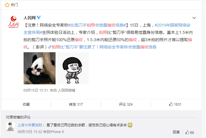 去年9月,某行业协会专家称,拍照时如果镜头距离够近,“剪刀手”照片通过照片放大技术和人工智能增强技术,可以将照片中人物的指纹信息还原出来。