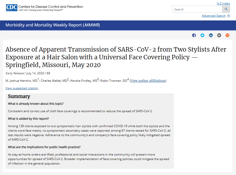 事实上,美国疾病控制和预防中心(CDC)围绕着密苏里州这家理发店内发生的事情已经提出一个全新的建议--美国各地的政策制定者应该考虑普及口罩要求。CDC刚刚发布的分析报告,其实标题是;"在一家有普遍口罩政策的发廊暴露后,两名发型师没有明显的SARS-CoV-2传播。"
