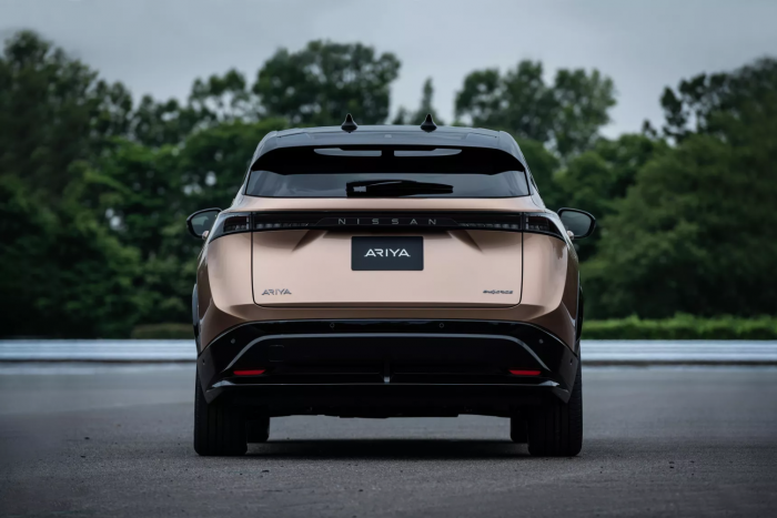 Ariya看起来比日产的另一款跨界车Rogue更运动。并且这款车并没有采用许多日产汽车上所用的尖锐、棱角分明的线条,反而选择了更柔和、更适合家庭使用的外观。尽管Ariya在技术上很先进,但它却没有将日产在其概念车中塞入的许多独特的花哨设计加入其中。