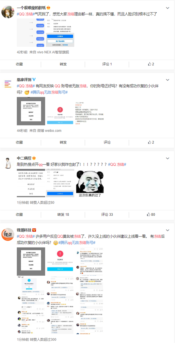 有网友表示:“我在空间跟人家发消息回聊的,突然qq就被冻结了,解冻试了各种方法比如按着提示发短信人脸识别没用,改密码没用,电话咨询也没用,试了一个多小时最后放弃了。”