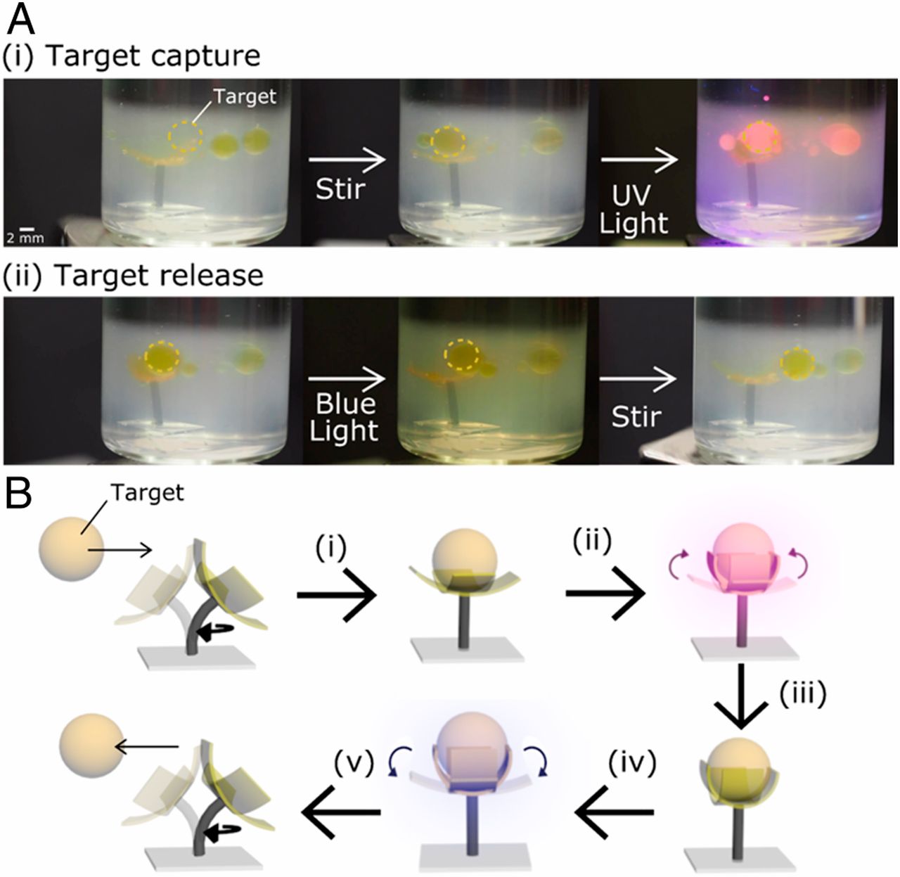 这些触手由光机械聚合物材料制成,能对不同波长的光做出反应。当受到紫外线照射时,触手会做出 “抓取 ”的反应,而蓝光则会使它们 “释放”。总的来说,这就形成了一个长一厘米的软性机器人,可以通过磁铁和光来抓取水下的小物体。