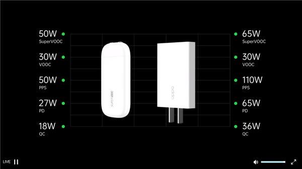 全新的110W mini超闪适配器兼容多种快充协议,支持65W SuperVOOC、30W VOOC、110W PPS、65W PD、36W QC等等。