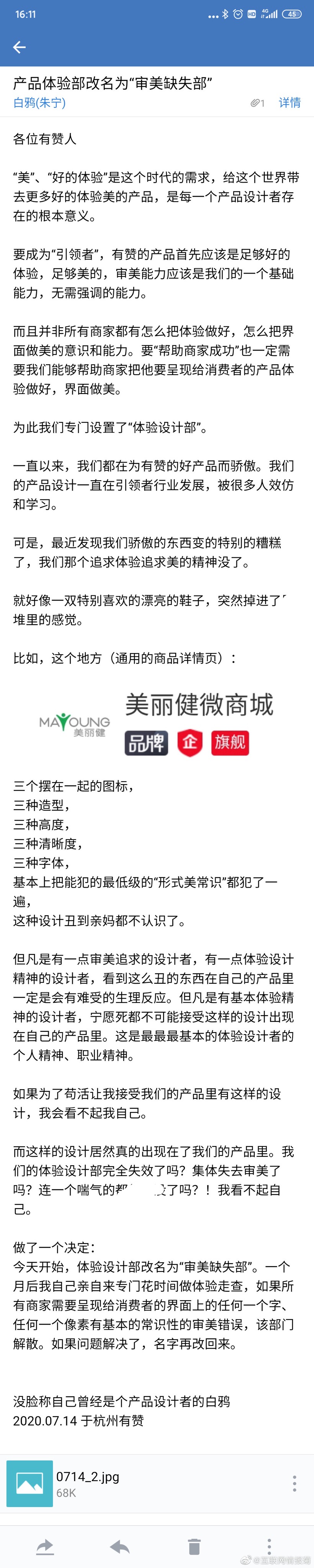 7月14日消息,有赞创始人白鸦宣布公司的产品体验部更名为“审美缺失部”,并警告员工说“一个月内解决不了问题,你们这个部门解散”。让白鸦发怒的起因是一个通用商品详情页的图标设计,白鸦在内部信中表示,这种设计“把能犯的最低级的形式美常识都犯了一遍,丑到亲妈都不认识了”。