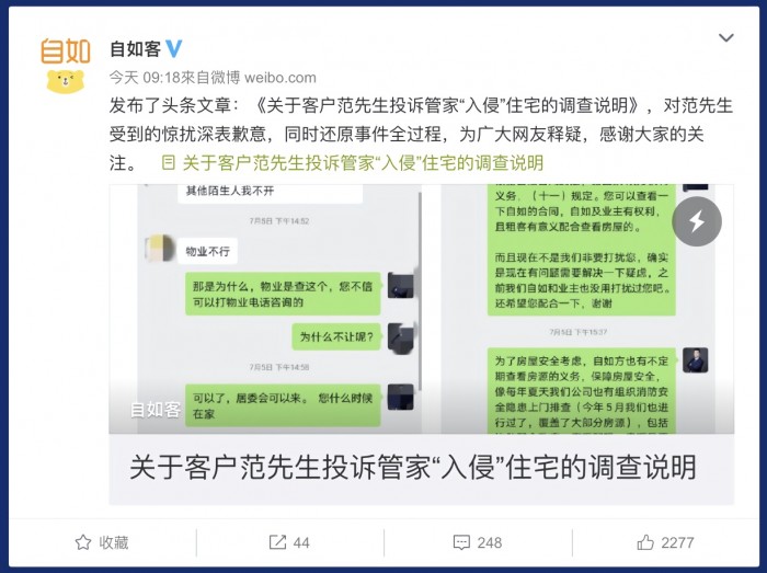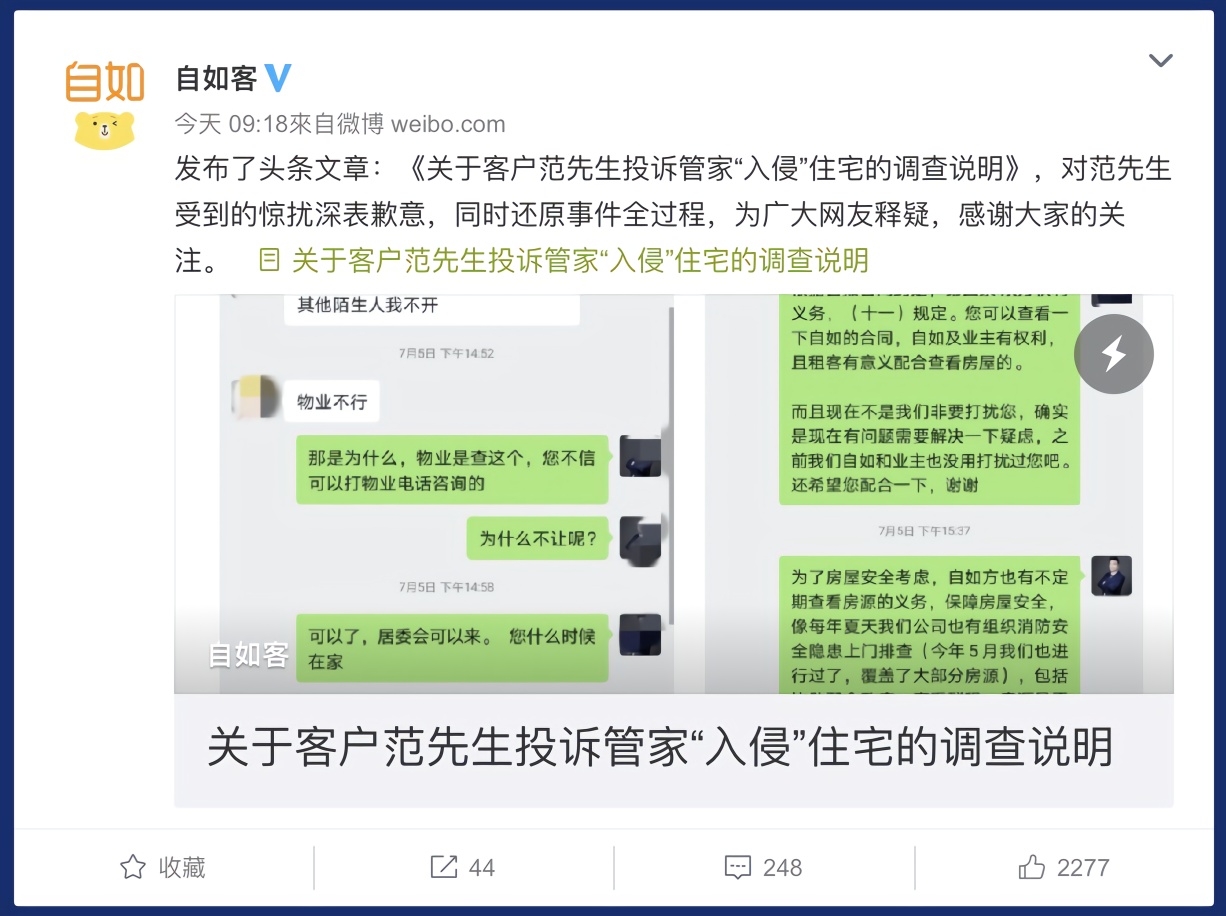 自如表示,“整个沟通过程中,业务经理和管家两人只通过半开的房门与范先生进行了简短的沟通,全程未进入范先生卧室……全程共计六次敲门并表明来意,但因为范先生处于熟睡状态,以及前面两道门离卧室距离较远,可能未能有效传递信息。”对于给范先生造成的惊吓和困扰,自如在调查说明中表达了歉意。