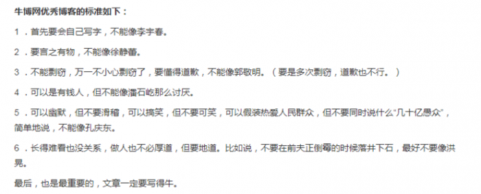 牛博网有着罗永浩的些许影子,从其博客标准便可看出一二(详情可参见图片内容)。不仅如此,牛博网还有“打死不删帖”的勇气,以及“言论绝对自由”的追求。