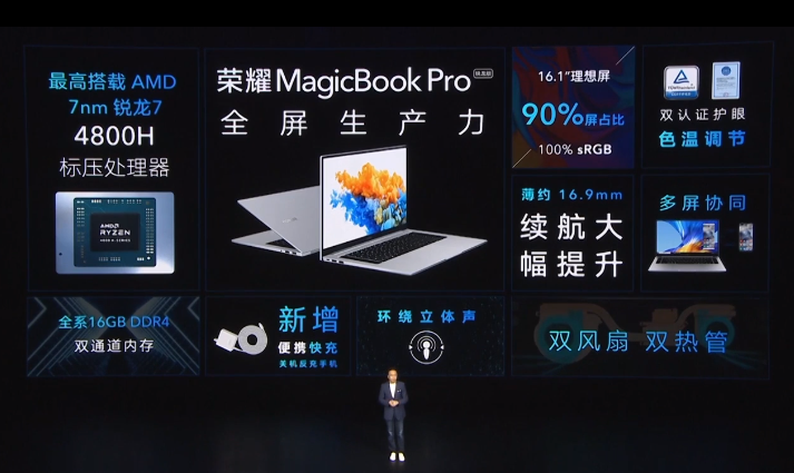 前不久,AMD、荣耀中国总部隔空互撩引发关注。今天下午,谜底揭晓。荣耀MagicBook Pro锐龙版正式发布,搭载全新AMD锐龙4000H系列标压处理器。荣耀MagicBook Pro锐龙版最高搭载AMD锐龙7 4800H处理器,7nm制程工艺,8核心16线程设计,主频达2.9GHz,最高加速频率可达到4.2GHz,大型图形设计软件、热门网络游戏运行更加流畅。