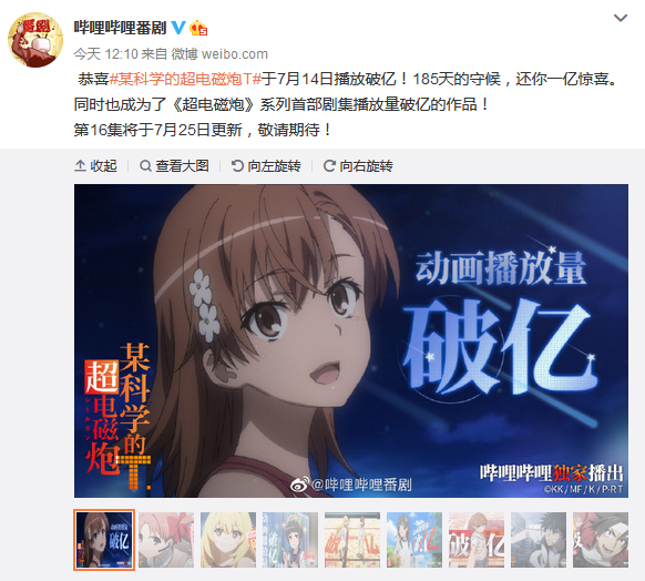 恭喜《某科学的超电磁炮T》于7月14日播放破亿!185天的守候,还你一亿惊喜。同时也成为了《超电磁炮》系列首部剧集播放量破亿的作品!第16集将于7月25日更新,敬请期待!