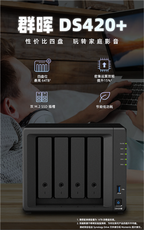DS420+是一款性价比四盘位NAS,搭载Intel Celeron J4025平台,2GB内存(最大支持6GB内存),最大内部净总储存容量64TB。