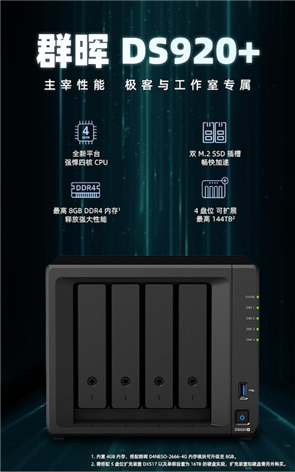 作为本次新品的“超大杯”,DS920+同样搭载四核Intel Celeron J4125,同样是DDR4内存,并且最高可扩展至8GB。同时兼具高扩展性的DS920+也提供了eSATA和M.2接口。最大内部净总储存容量64TB,搭配扩充装置之最大净总储存容量144TB。