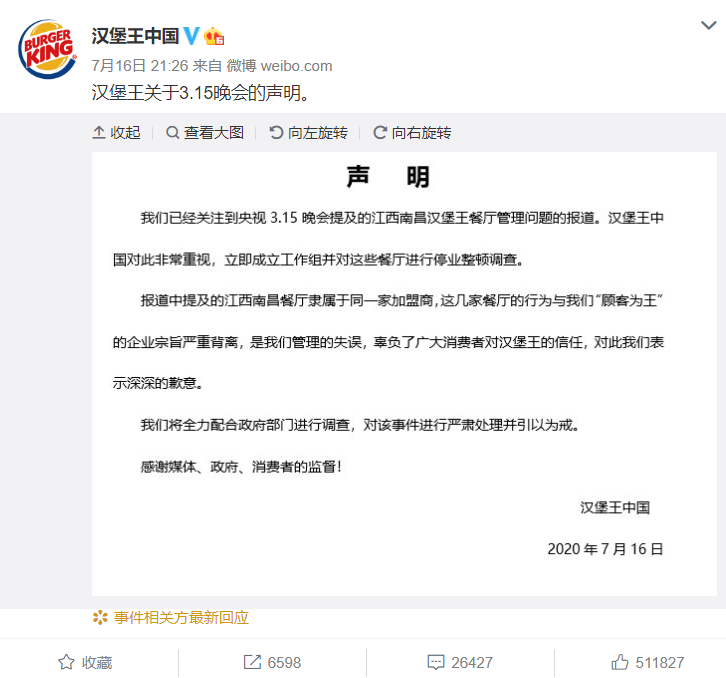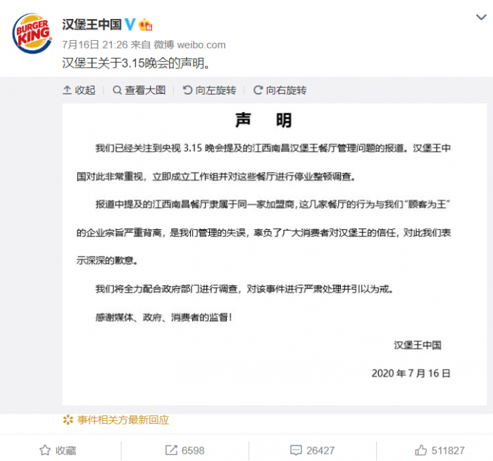 报道中提及的江西南昌餐厅隶属于同一家加盟商,这几家餐厅的行为与我们的“顾客为王”的企业宗旨严重背离,是我们管理的失误,辜负了广大消费者对汉堡王的信任,对此我们表示深深的歉意。