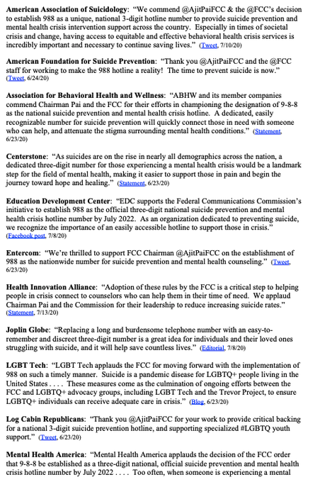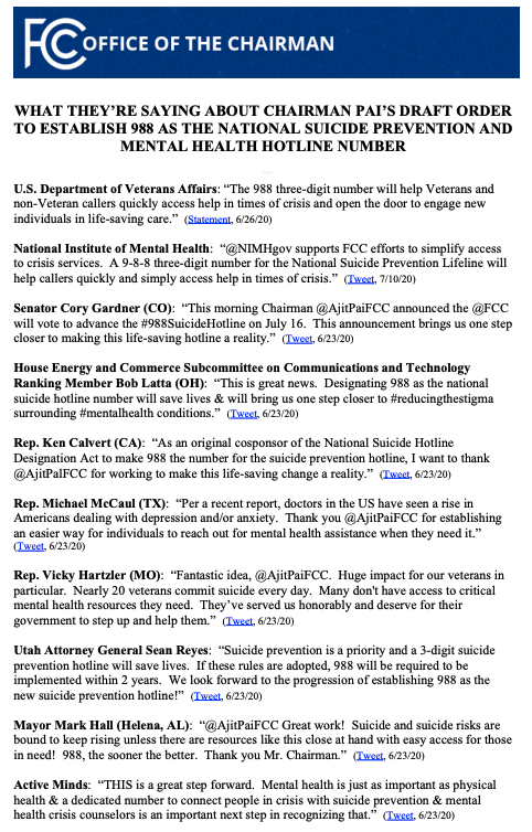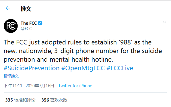 当地时间周四,美国联邦通信委员会(FCC)通过一项新规,确认将 988 设立为全国预防自杀和心理健康热线。上月在接受外媒 CNET 采访的时候,FCC 主席 Ajit Pai 表示希望通过这条热线推动全社会关注心理健康话题。