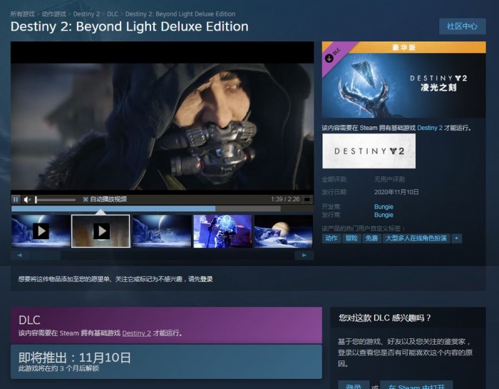 知名游戏开发商 Bungie 宣布,受 COVID-19 疫情影响,新《命运2:凌光之刻》的发布时间推迟到11月10日。该 DLC 原定于今年9月22日发布。