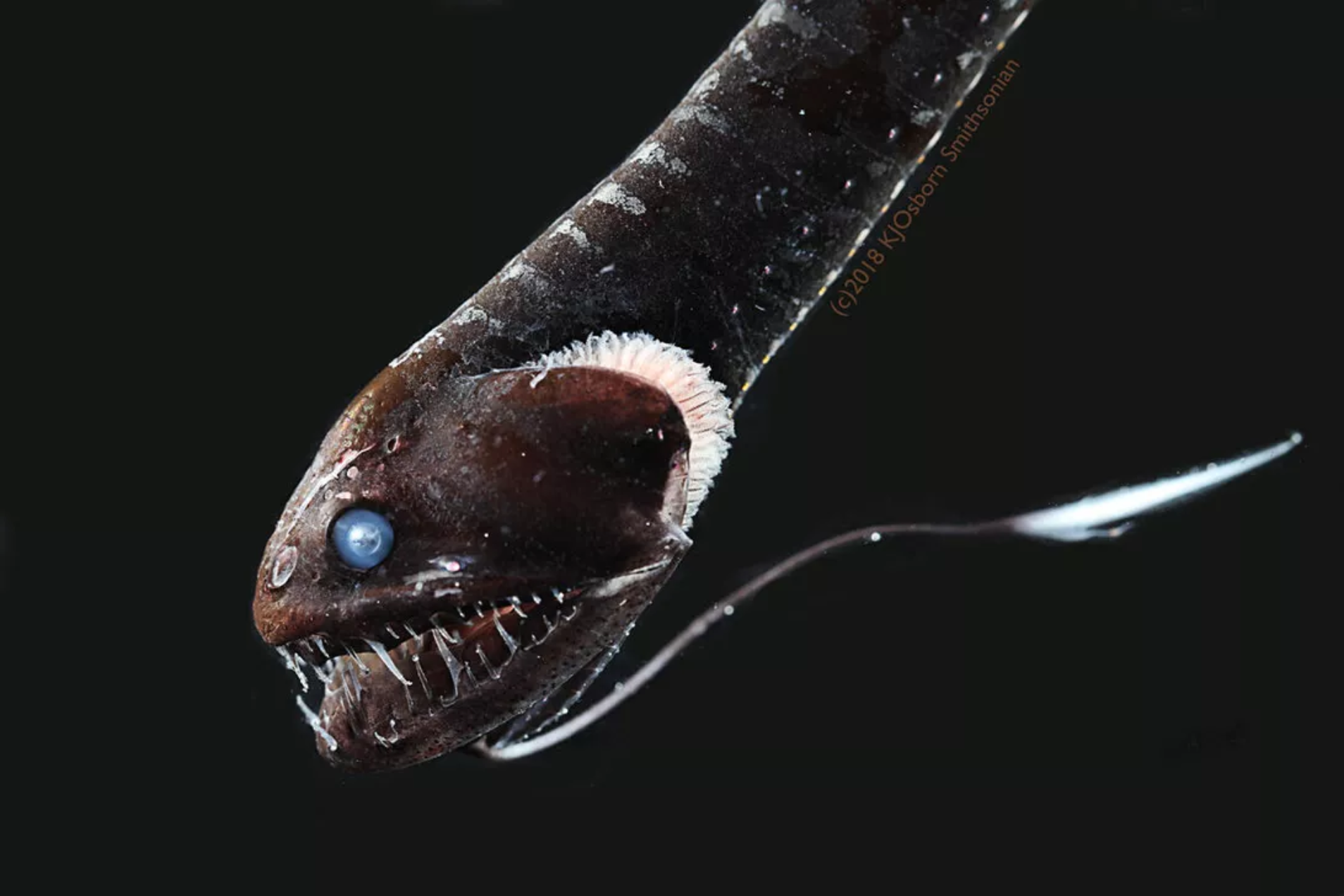 幸运的是,Osborn还是捕捉到了一条超黑深海龙鱼和一条角高体金眼鲷的惊人牙齿。