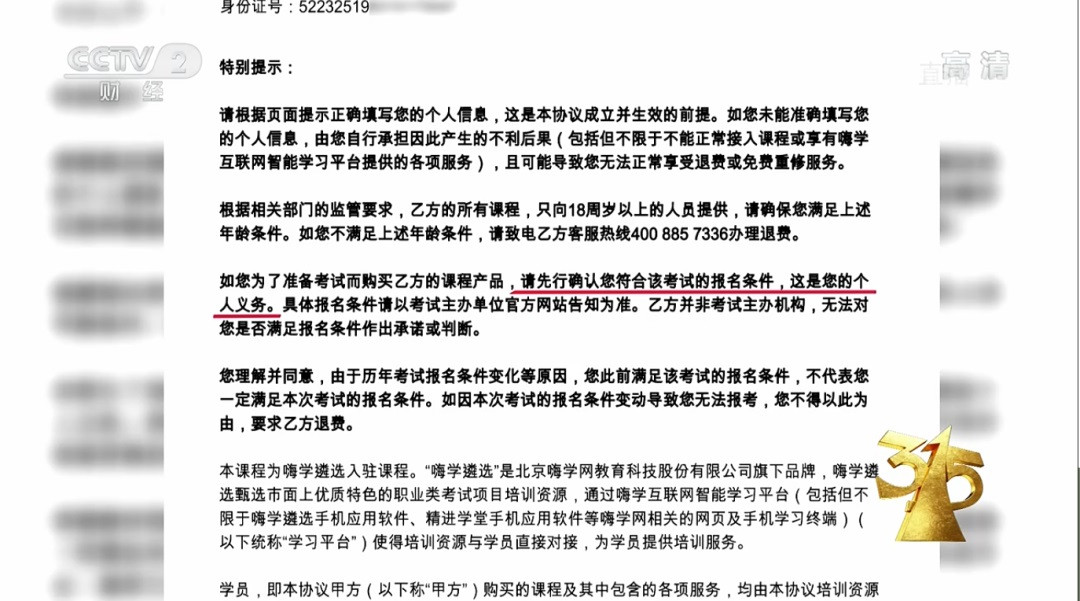嗨学网客诉部门还特别告诉小维,学员在激活课程时,订单下方有一个嗨学网课程服务协议,协议中提示是否符合报名条件是学员的个人义务,更重要的是该协议取代双方先前的或现在的所有陈述建议、讨论和通讯,无论是口头的还是书面的。看到这样的规定,小维傻了眼,因为她清楚地记得,当初在激活课程时都是销售在代为操作,她只是点了付款选项。