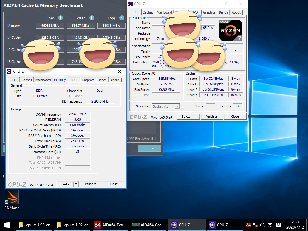 AMD预计月底正式发布锐龙4000系列桌面APU处理器,日前,网友ITcooker再次对提前拿到的锐龙7 4700G进行了一番压力测试,不妨先睹为快。锐龙7 4700G识别为8核16线程,4MB L2、8MB L3,基础频率3.6GHz,加速4.45GHz,集成Vega8集显,频率高达2100MHz,热设计功耗65瓦。