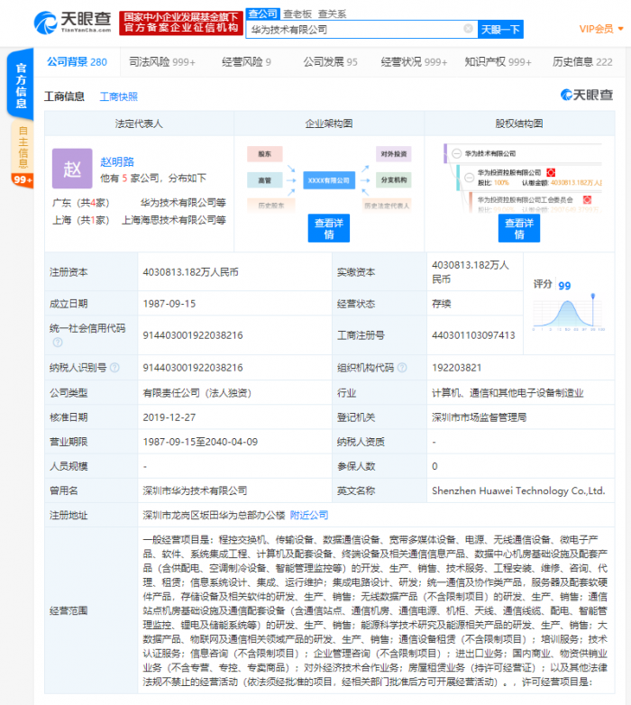 天眼查数据显示,华为技术有限公司成立于1987年9月,法定代表人为赵明路,注册资本约403.08亿人民币,公司经营范围包括一般经营项目是:程控交换机、传输设备、数据通信设备、宽带多媒体设备、电源、无线通信设备、微电子产品、软件、系统集成工程、计算机及配套设备等。该公司由华为投资控股有限公司全资持股。