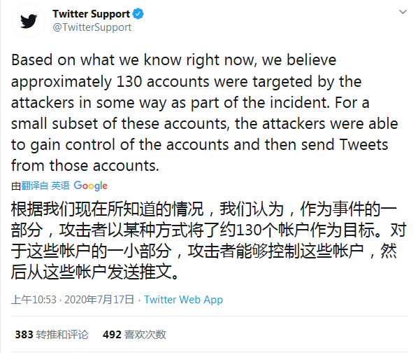 针对本周较早时候发生的大规模黑客入侵事件,推特在最新推文中持续更新了调查情况。在推文中表示大约有 130 个账号遭到攻击,而且这些被攻击的账号中有少部分账号被攻击者完全控制,然后通过这些账号发送推文。