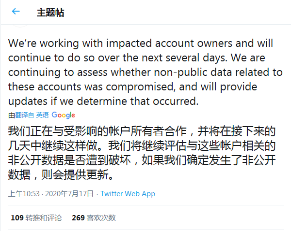 推特表示目前正和受影响的账户进行交流的同时,在接下来几天中还将会继续展开本次事件的调查工作。推特将继续评估与这些帐户相关的非公开数据是否遭到破坏,如果确定发生了非公开数据,则会提供更新。