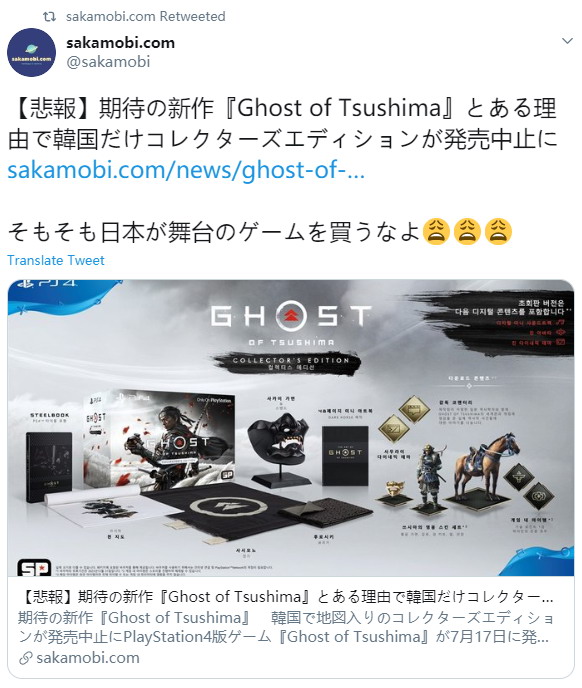 今日(7月17日)PS4大作《对马岛之鬼》正式发售,有油管主已经放出了典藏版开箱视频。现在据日媒sakamobi报道称,因为对马岛的领土争议,韩国禁售了《对马岛之鬼》典藏版。
