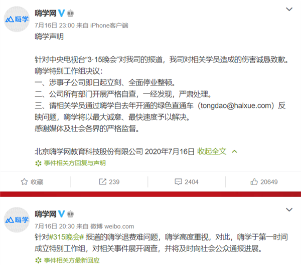 昨天晚上的央视315晚会上,在线职业教育服务商嗨学网因为“退费难”问题被点名批评。北京嗨学网教育科技股份有限公司当即连发两条声明,对相关学员造成的伤害诚恳致歉,同时涉事子公司即日起立刻、全面停业整顿,所有部门开展严格自查,一经发现,严肃处理。
