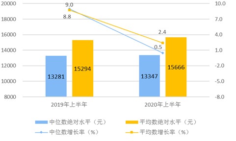 上半年,全国居民人均可支配收入中位数13347元,增长0.5%,中位数是平均数的85.2%。其中,城镇居民人均可支配收入中位数19617元,增长0.4%,中位数是平均数的90.6%;农村居民人均可支配收入中位数6682元,增长1.2%,中位数是平均数的82.8%。