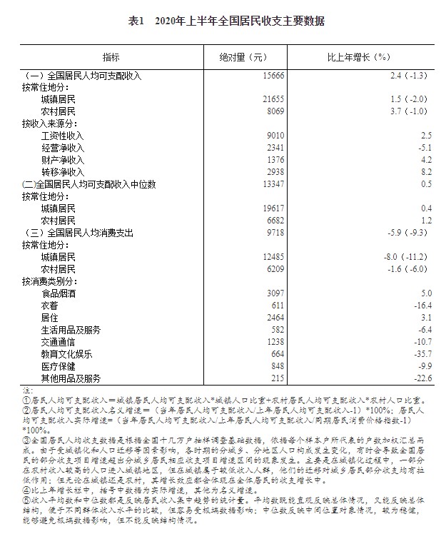 上半年,全国居民人均消费支出9718元,比上年同期名义下降5.9%,扣除价格因素,实际下降9.3%。其中,城镇居民人均消费支出12485元,下降8.0%,扣除价格因素,实际下降11.2%;农村居民人均消费支出6209元,下降1.6%,扣除价格因素,实际下降6.0%。