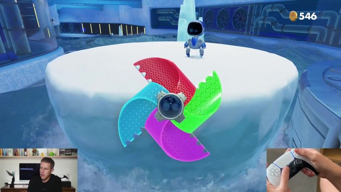 TGA节目主持人GeoffKeighley今晚首次公开展示了PS5手柄DualSense,并试玩了PS5内置游戏《Astro's Playroom》的演示demo,展示了手柄的触觉反馈、自适应扳机、触摸板、吹气等特性。他还将DualSense与之前的PS4 Dualshocker4手柄进行了对比。