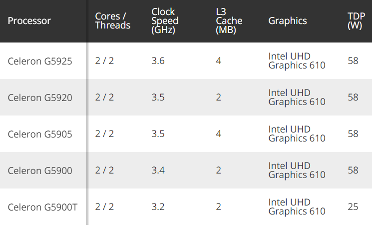 Intel十代桌面酷睿发布还不到三个月时间,升级版就来了,只不过是最入门的赛扬系列,不只是有频率的提升,还有三级缓存的开放。这一代赛扬有三款型号,分别是赛扬G5920 3.5GHz、赛扬G5900 3.4GHz、赛扬G5900T 3.2GHz,都是2核心2线程,2MB三级缓存,UHD610核芯显卡,DDR4-2666内存,热设计功耗前两款58W、后一款35W。
