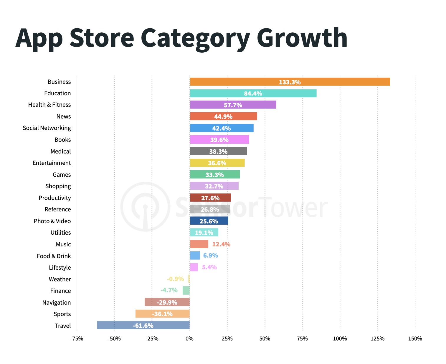 这导致美国的下载量激增,因为突然间,人们不得不在家工作,在家上学,在家用应用、游戏和流媒体服务来娱乐自己。Sensor Tower告诉TechCrunch,第二季度美国商业和教育应用的增长尤为显著,因此。这些类别是美国超过中国安装量的最大贡献者。第二季度商务应用下载量增长133.3%,其次是教育(84.4%)、健康与健身(57.7%)、新闻44.9%)和社交网络(42.4%)。