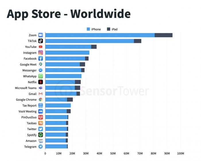 尤其是视频会议应用Zoom,在本季度取得了突破性的成绩,甚至打破了App Store安装量的记录,单季度总下载量接近9400万。此前的纪录是由TikTok创造的,该公司在2020年第一季度的单季度下载量为6700万。Sensor Tower指出,还没有其他非游戏应用在一个季度内超过5000万的安装量。