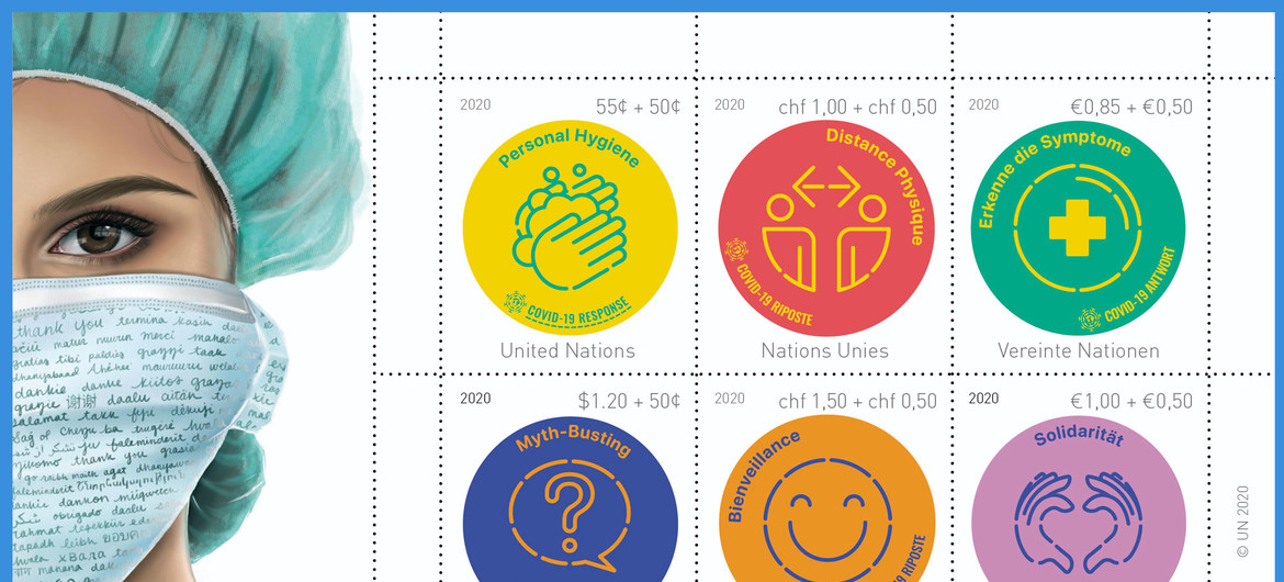 联合国纽约邮局发行的55美分邮票主题是“个人卫生”,黄色圆形背景中的图案是洗手。1.20美元邮票主题是“阻止谣言”,蓝色圆形背景中的图案显示对所谓的信息打上了问号。