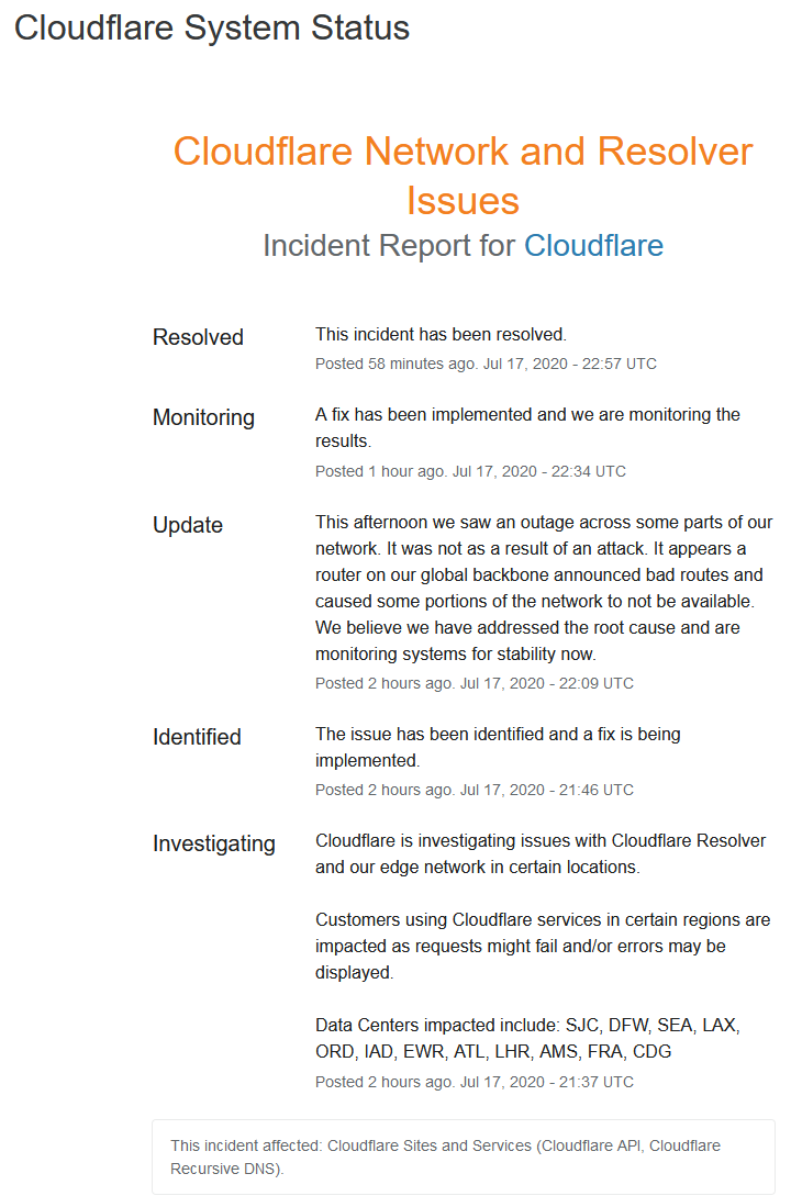 在Cloudflare的部分网络服务出现故障后,几个热门网站在周五变得无法访问。受影响的系统主要是DNS服务,受影响的网站包括Shopify、Politico、Discord和League of Legends等使用其解析服务的网站,这次中断似乎持续了约30分钟。