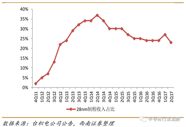 台积电28nm节点占营收的百分比(图源:西南证券)