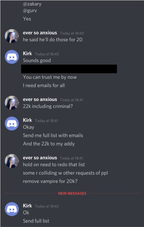 Kirk先是在周二晚些时候通过Discord联系了lol,然后又在周三联系了“ever so anxious”,问他们是否想成为Kirk的中间人,向那些他们拥有很高名气的网络黑市出售Twitter账号,并且能够从每笔交易中抽成。