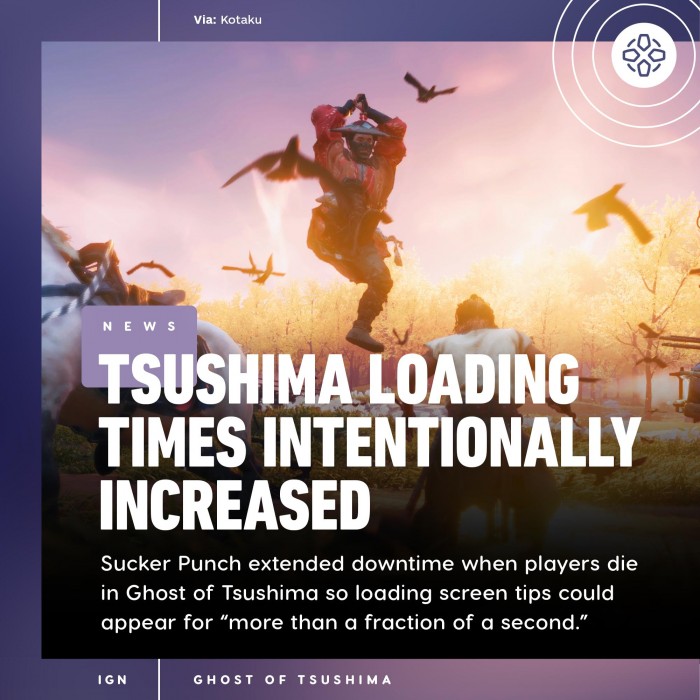 但开发团队发现由于《对马岛之鬼》的死亡加载时间实在太快,以至于阅读提示的时间根本不够。Adrian Bentley 透露,在游戏项目后期,他们决定人为地延长这些情况下的加载时间,让这些小提示可以在屏幕上显示“超过一秒”。