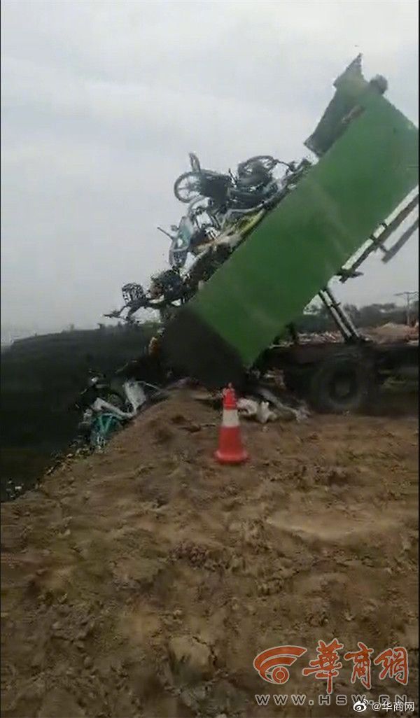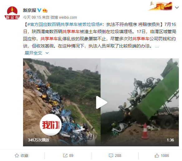 据媒体报道,近日,有陕西渭南网友在网络曝光了数百辆共享单车倾倒入十几米深的垃圾坑的视频,引起网友热议。从曝光的视频里可以看到,多辆渣土车先后将这些共享单车倒入十几米深的垃圾坑中,现场扬起一阵灰尘。