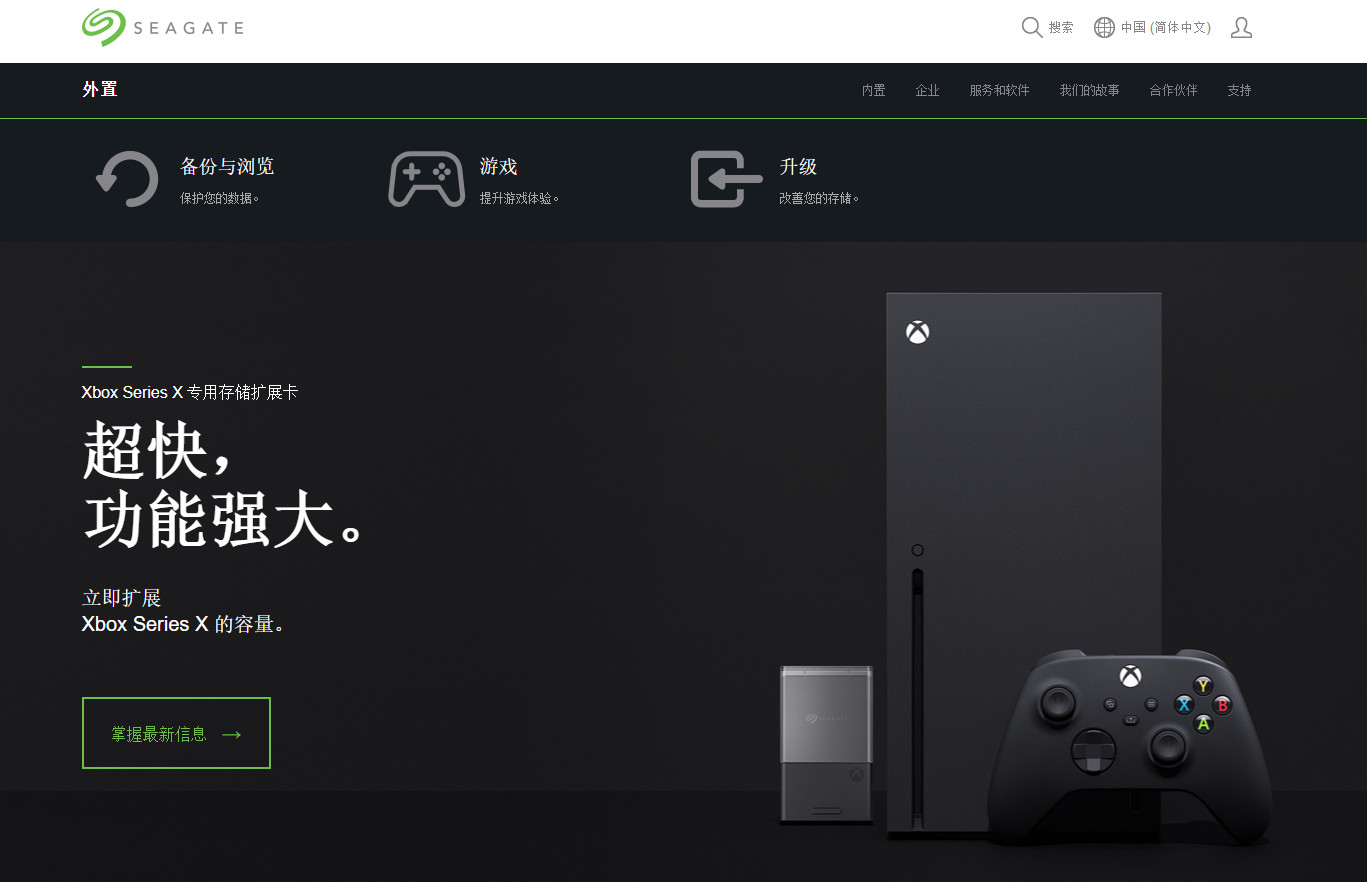 进入到次世代,游戏的容量将会越来越大,玩家将会需要更大的存储空间。微软次世代主机Xbox Series X本身内置了1TB NVMe协议SSD(PS5是825GB),此外该主机还支持外插存储卡。此前微软在公布XSX时提到了和希捷合作的1TB扩展卡,性能和内置的SSD一致,而现在希捷的这个存储卡的官网也已上线。