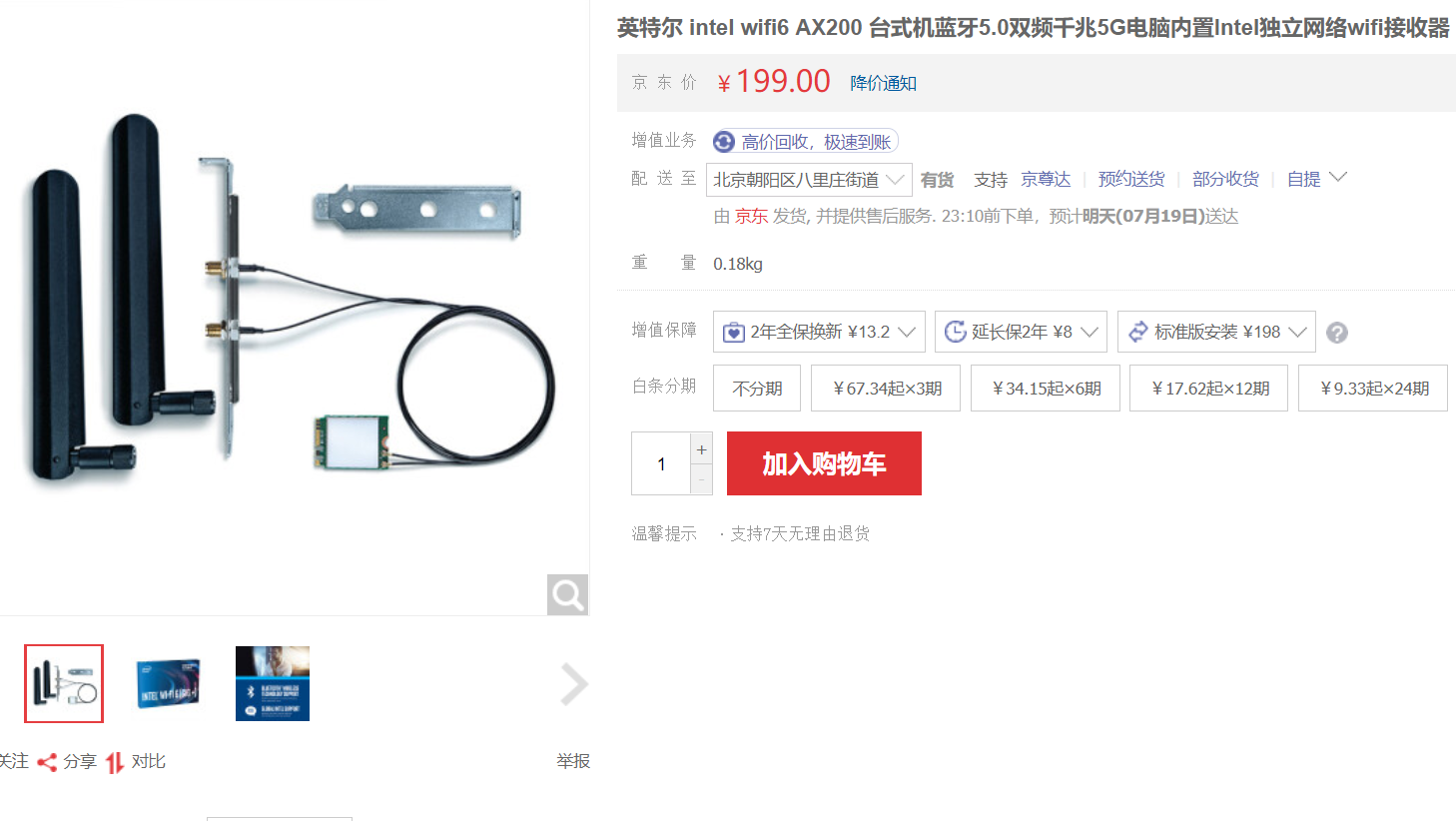 Wi-Fi 6这两年快速普及,高端智能手机、笔记本、桌面主板已经基本标配。如果你的笔记本或者台式机想升级Wi-Fi 6,不妨考虑一下Intel出品的这款AX200 Wi-Fi 6无线网卡套装,价格仅为199元。它包含M.2 2230规格网卡、双天线、挡板等等,完全支持Intel Gig+,也就是加强版的Wi-Fi 6。