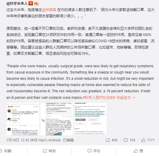 科普博主@科学未来人针对这个问题做了解释,感冒减少的原因复杂,但是口罩的作用一定是离不开的,英国的大学团队之前已经进行了相关研究。