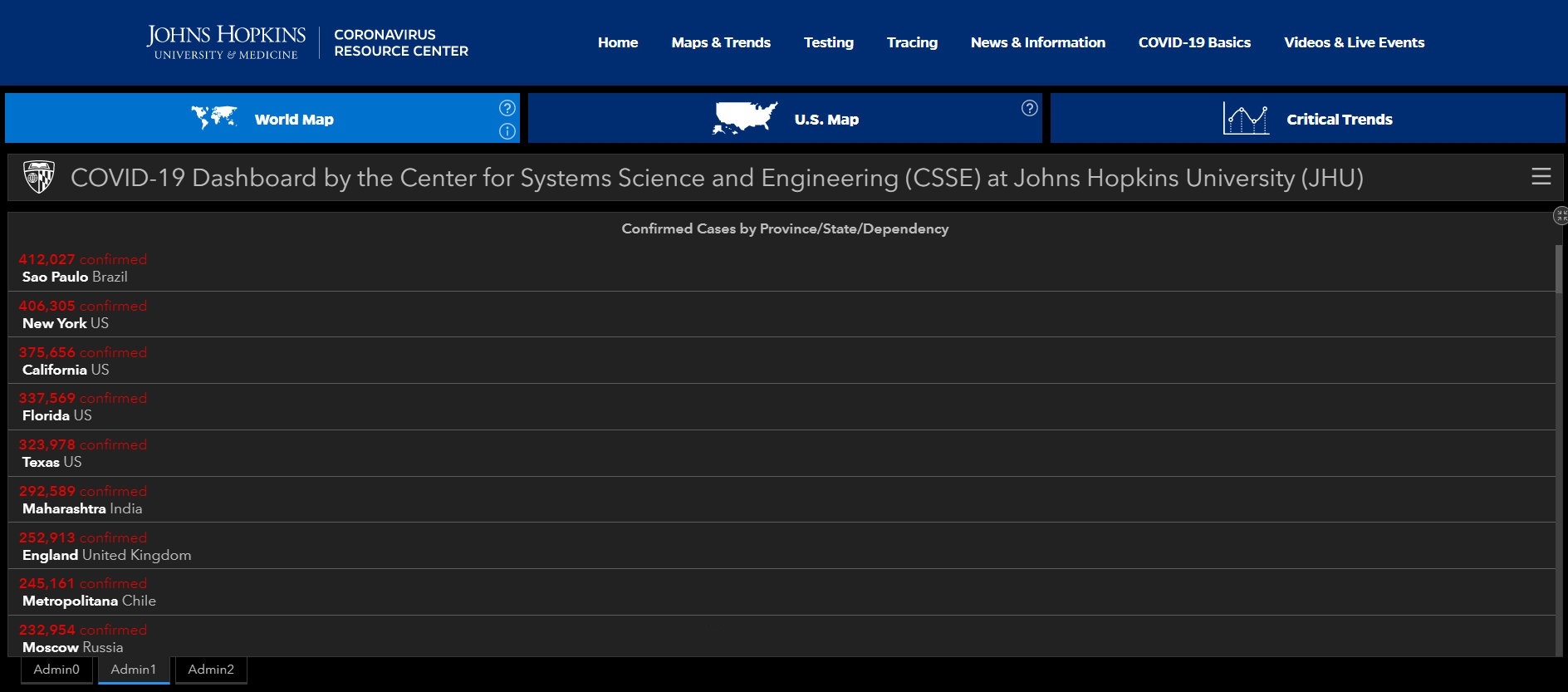 第三到第五名也都被美国占据,分别是375656例的加利福尼亚州、337569例的佛罗里达州、323978例的德克萨斯州,再往后是印度Maharashtra、英国英格兰、智利Metropoliitana、俄罗斯莫斯科。