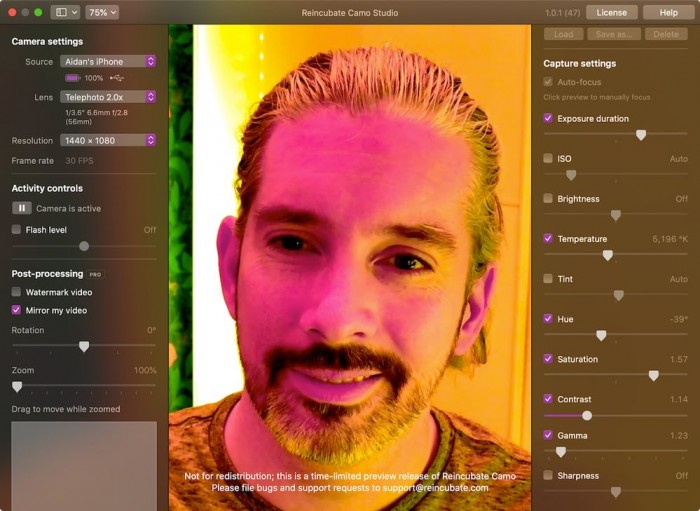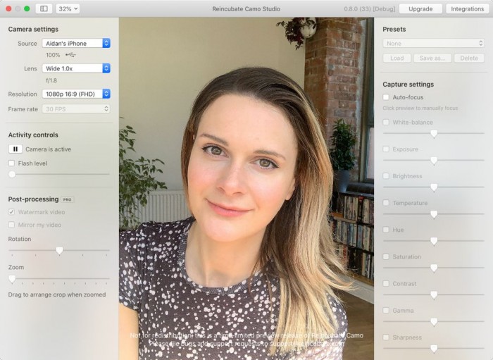 迷彩有免费版和付费版。我们希望用户出于不同的原因喜欢这两个版本。Camo的免费版本非常适合高质量通话,但缺乏调整。它提供高达 720p 视频的分辨率,包括设备的自拍镜头或主后镜头(较宽的镜头)。您可以连接多个iOS设备并在它们之间切换。