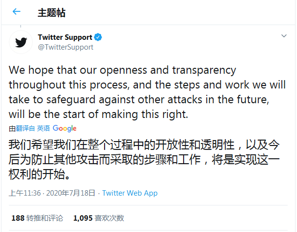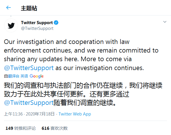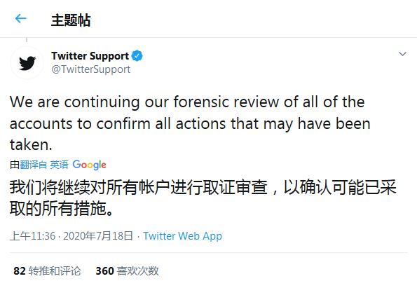 目前推特已经对所有账号进行了取证审查,以确认可能已采取的所有措施。推特表示正加大调查力度,并通过和执法部门的合作继续推进事件的调查。推特希望增强调查过程中的开放性和透明度,并采用更多安全措施防止此类事件的再次发生。