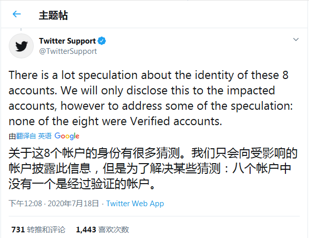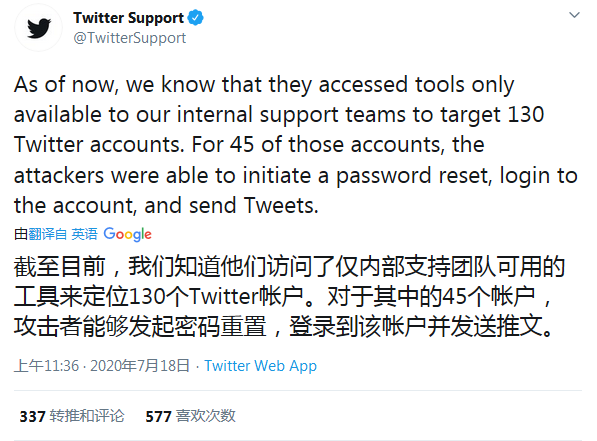针对本周较早时候发生的大规模黑客入侵事件,推特在最新推文中持续更新了调查情况。推文中表示,黑客利用仅内部支持团队可用的工具向 130 个推特账号发起了攻击,其中有 45 个账号被黑客重置密码,登陆到该账号并发送有关于比特币的推文。